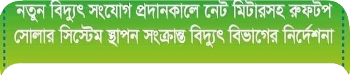 ১০ বা তদুর্ধ্ব কিলোওয়াট লোড বরাদ্দপ্রাপ্ত বিদ্যুৎ গ্রাহকগণের অনুমোদিত লোডের ১০% ক্ষমতার সোলার সিস্টেম নেট মিটারিং নির্দেশিকা-২০১৮ (সর্বশেষ সংশোধিত) অনুসরণ করে স্থাপন করতে হবে। তবে অনূর্ধ্ব ১০ কিলোওয়াট লোড বরাদ্দ প্রাপ্ত গ্রাহকগণ আগ্রহী হলে রুফটপ সোলার সিস্টেম বসাতে পারবেন এবং স্থাপিত সিস্টেমের ক্ষমতা ১ কিলোওয়াটের (১০০০ ওয়াট) বেশি হলে নেট মিটারিং নির্দেশিকা অনুসরণে তা করতে হবে।